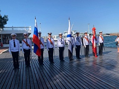 As part of the solemn event, wreaths were laid at the Eternal Flame at the Memorial of the Heroic Defense of Sevastopol 1941-1942. Igor Mikheev, Vice-Governor of Sevastopol and Vyacheslav Rodionov, Deputy Commander of the Black Sea Fleet, who were present at the ceremony, said parting words to the participants of the sea voyage.