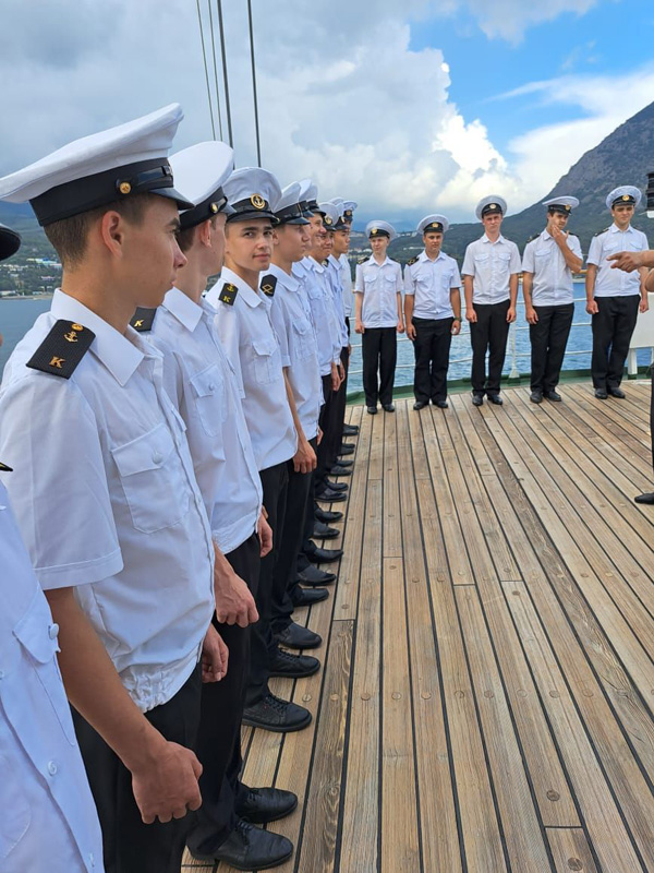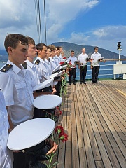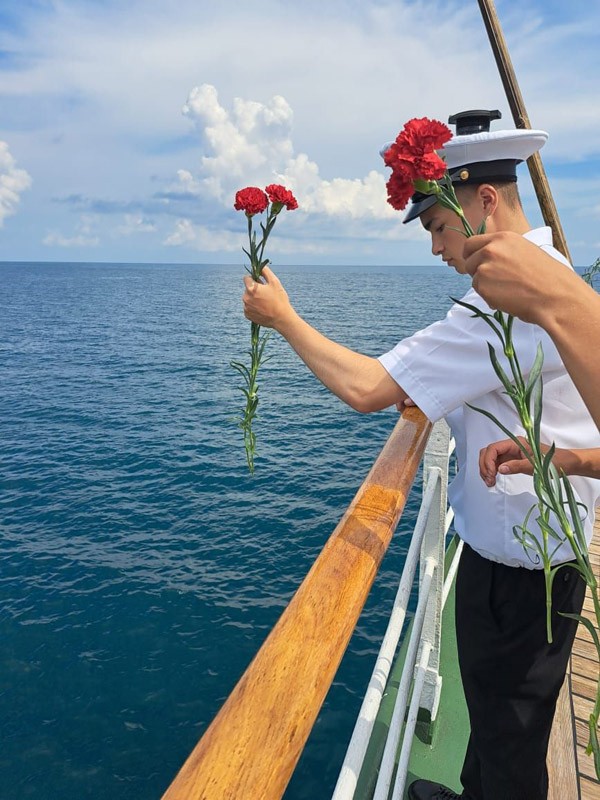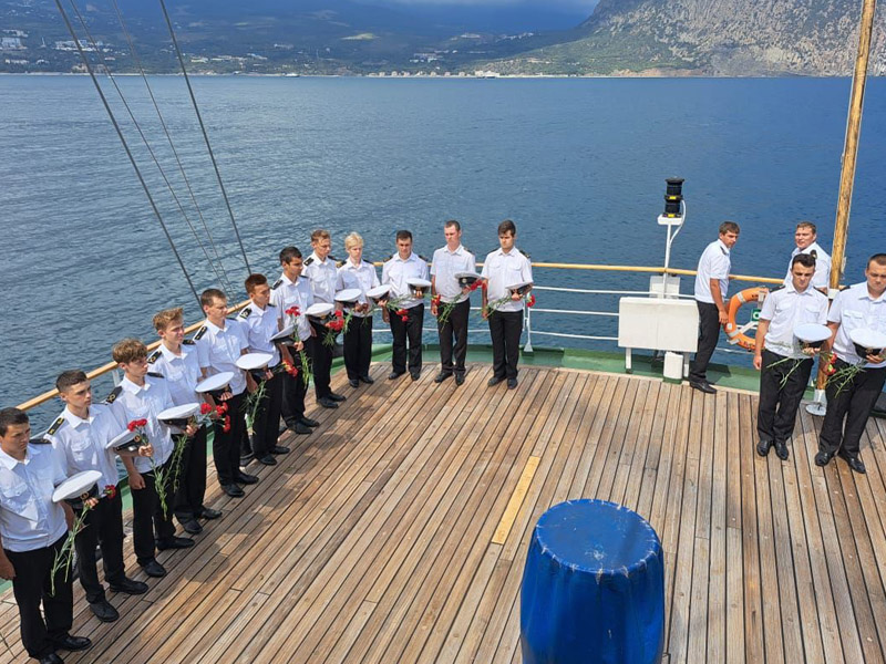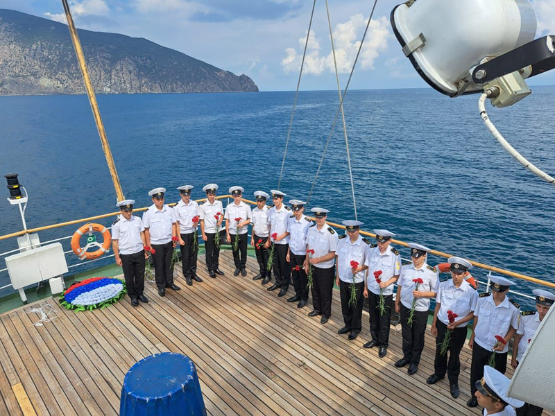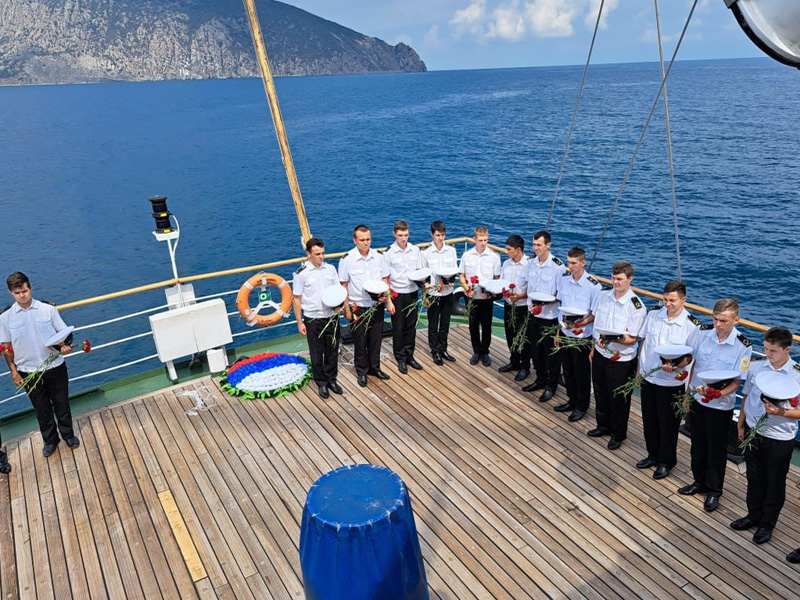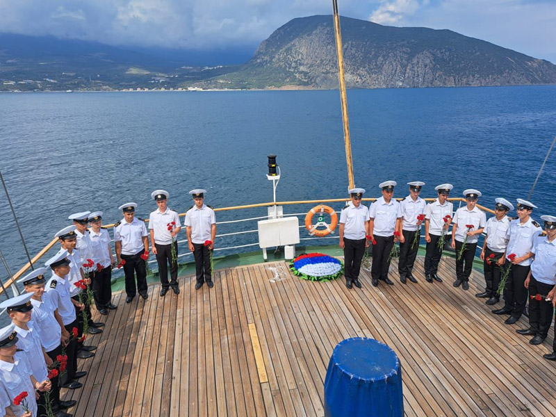 On August 19, 2022, the crew of the Khersones and the cadets undergoing navigation practice on the sailboat, together with the participants of the “Black Sea Memory Sails” cruise, honored the memory of those who died as a result of the wrecking of the vessel at anchorage of the Artek International Child Center.