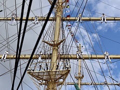After the parade of ships, 10 sailing vessels and yachts, including the Mir frigate, first time ever passed in the opposite course along the spectator stands and the parade line of Navy submarines of Russia.