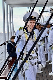 The Mir sailboat together with other sailing vessels met the celebration in the waters of the Kronstadt raid, where the sailboats welcomed the tactical groups consisting of 11 ships of the Russian Navy. 118 cadets of the Admiral Makarov State University of Maritime and Inland Shipping had the honor to take part in the military parade on the frigate of FSUE “Rosmorport”.
