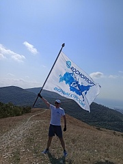Flag of the “ROSMORPORT – 20 years in the right direction!” campaign installed on one of the highest mountain peaks around Novorossiysk