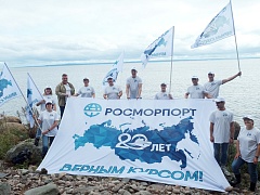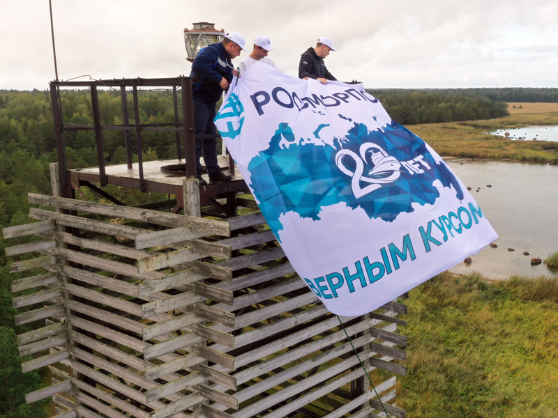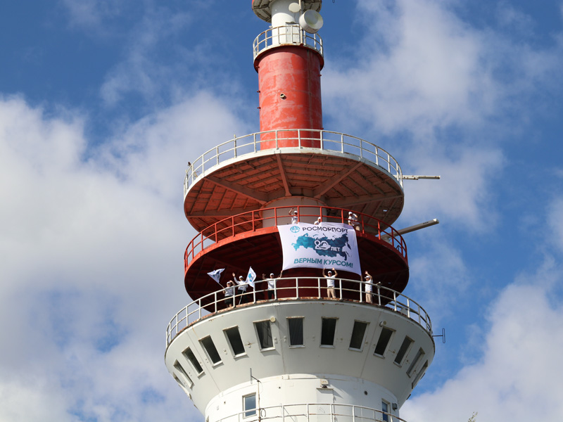 The anniversary campaign “ROSMORPORT – 20 years in the right direction!” was held in the FSUE “Rosmorport” North-Western Basin Branch. Employees of the branch installed flags with the anniversary symbols of the enterprise on various unique geographical sites of St. Petersburg, Leningrad and Kaliningrad regions.