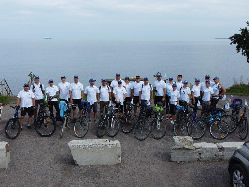 The Kaliningrad Department of the North-Western Basin Branch was the first to pick up the baton from its colleagues from other regions. 24 employees in branded outfits made a bicycle ride from the resort town of Zelenogradsk to the village of Zaostrovye on Cape Gvardeysky, where in 2023 a 61-meter tower of automatic radar technical post No. 5 (ARTP-5) was erected as part of the project for the reconstruction of the Kaliningrad Vessel Traffic System. The participants covered a 20-kilometer route along the Baltic Sea to install 3x4 m flags with the anniversary symbols of the enterprise on the ARTP-5 tower, which is under the operational management of FSUE “Rosmorport”.