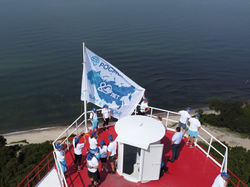 The 77 m high radio mast is a dominant feature on the southern shore of the Neva Bay of the Gulf of Finland, and it has rightfully become a visiting card of Peterhof and a favorite photo spot for tourists and locals. The Raskat RTP was built in the early 2000s to replace the coastal radar station installed in 1960 for information processing and interaction with vessels in the Gulf of Finland water area and related services. Considering meteorological conditions, for safety reasons, the team decided to hang the corporate flag with the anniversary symbols on the radio mast at a height of 46 meters.
