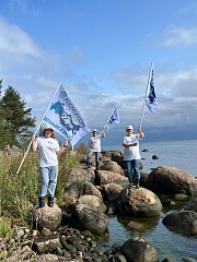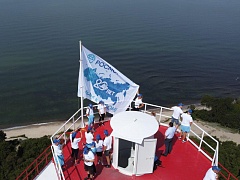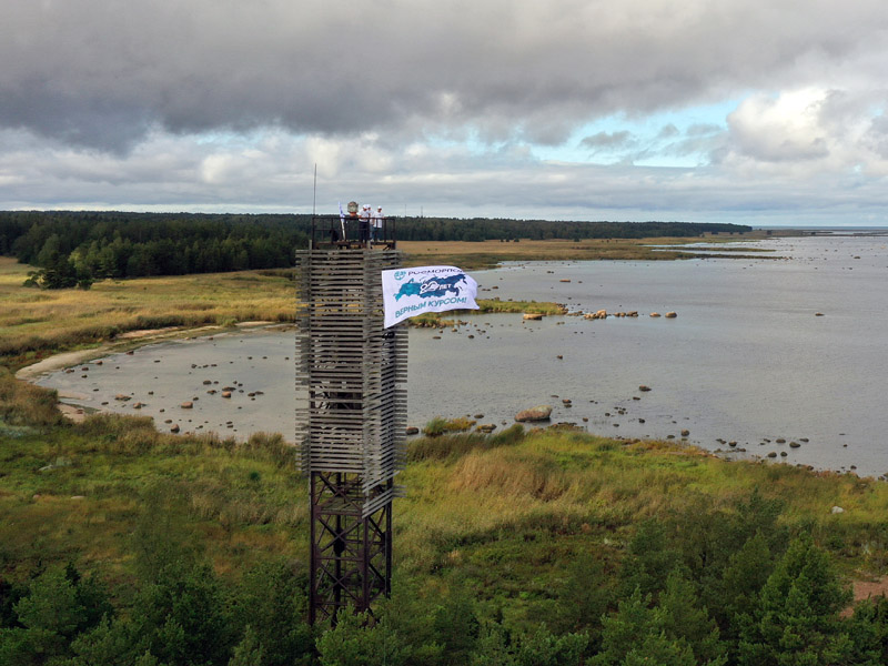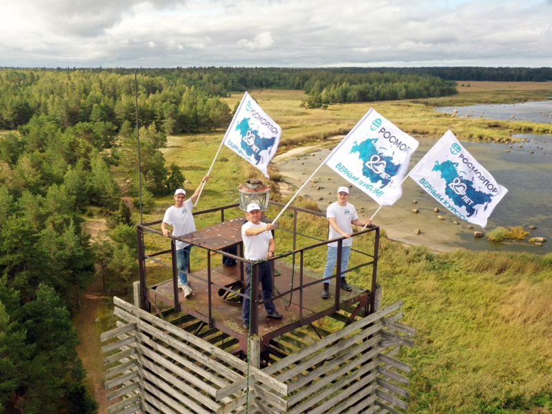 The light beacon, which is under the operational management of FSUE “Rosmorport”, is situated in the north-western part of the peninsula. The participants had to overcome the last and most difficult part of the way to the site where the flags were installed through a swampy forest area. A flag with the anniversary symbols of the “ROSMORPORT – 20 years in the right direction!” campaing was installed on the 25.2 m high light beacon, which was built in 1960 and is serviced by the Ust-Luga Department of the North-Western Basin Branch. The range of daytime visibility (geographical) is 14 nautical miles. A mesmerizing panorama of the Baltic Sea opened up to the participants from this viewpoint.