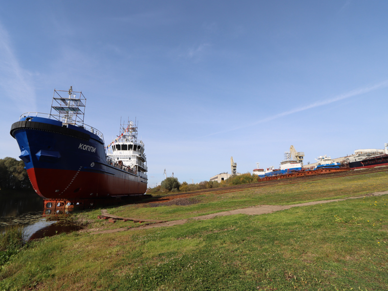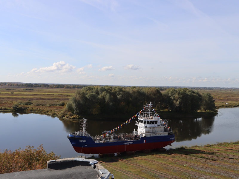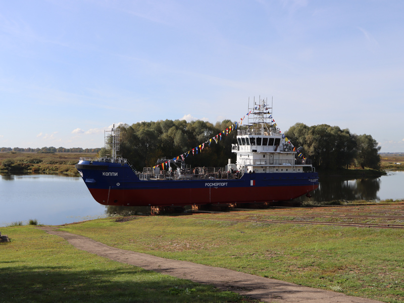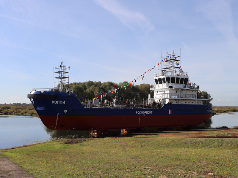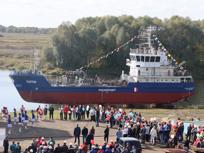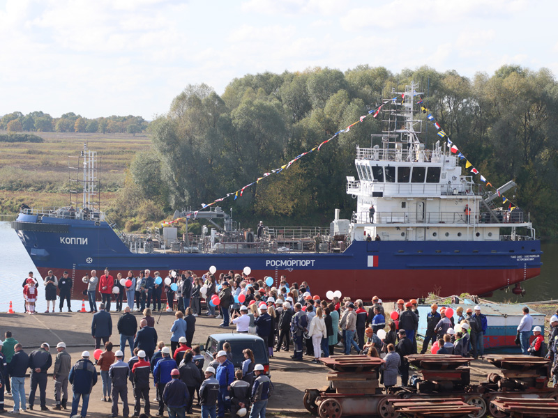 On September 26, 2023, the Koppi bilge water removing ship (BWR), which is being built for the FSUE “Rosmorport” North-Eastern Basin Branch, was set afloat. The solemn launching ceremony took place at Okskaya Shipyard JSC (town of Navashino, Nizhny Novgorod Region).