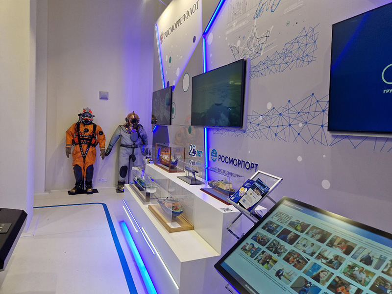 In addition, visitors can see diver’s suits provided by FSBI “Morspassluzhba” in the exposition hall, as well as a simulator for a-Navigation and e-Navigation of Federal State Institution of Higher Education “Russian University of Transport” allowing everyone to try controlling the country's first dual-fuel eco-ferry “Marshal Rokossovsky”, and “Polar Express” of FSUE “Morsvyazsputnik” – the project of the transarctic underwater fiber-optic communication line Murmansk–Vladivostok.