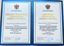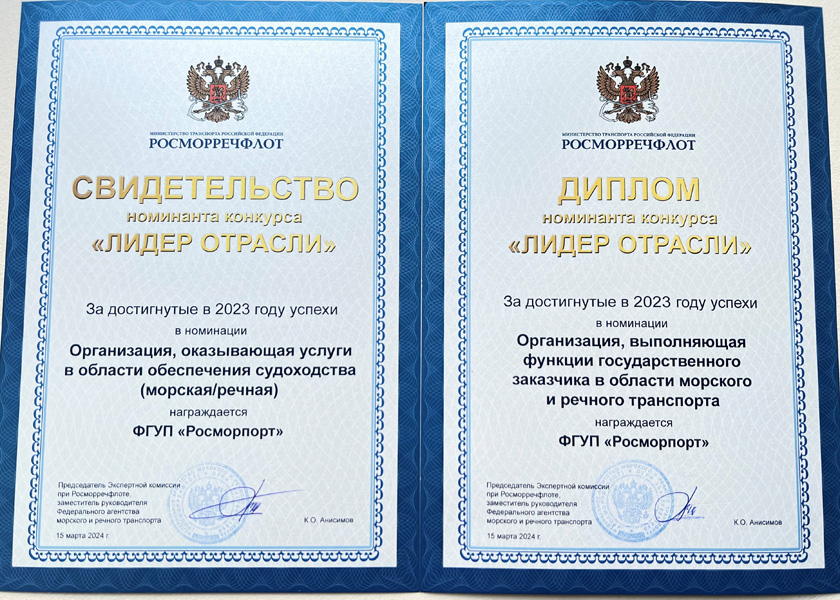 FSUE “Rosmorport” was awarded two prizes in the nominations of the Rosmorrechflot's Industry Leader annual contest based on the results of work in 2023. As in the previous year, the company was declared by the expert commission as the winner in “The Best organization providing navigation services (maritime/river)” category. In 2024, FSUE "Rosmorport" was also awarded a diploma in the new nomination “The Best organization performing the functions of a state customer in the field of maritime and river transport".