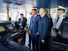 After visiting the territory of the Railway Ferry Complex, the delegation headed by Minister of Transport visited the innovative Marshal Rokossovsky dual-fuel ferry, one of the two technological vessels of FSUE “Rosmorport” that were delivered to the Seaport of Ust-Luga – seaport of Kaliningrad line in 2022. In 2023, the enterprise's ferries were the first in Russia to receive certificates of marine autonomous and remotely operated surface vessels (MANS) and began commercial operation in autonomous mode.