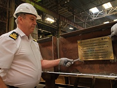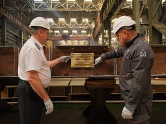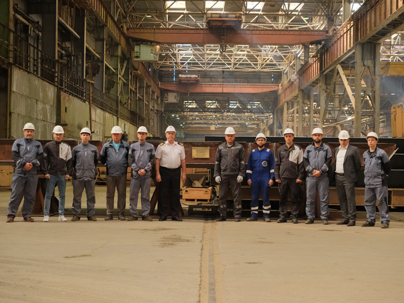 The solemn event was attended by Yuri Michurov, Chief Engineer of the FSUE “Rosmorport” Astrakhan Branch, Viktor Kulagin, Engineer-Inspector of the Russian Maritime Register of Shipping, Vladimir Kazakbayev, Deputy General Director for Shipbuilding of Stroyliderplus LLC, and other representatives of the construction plant.