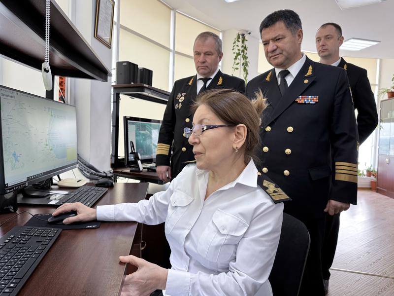 The heads of Rosmorrechflot and FSUE "Rosmorport" visited the Control Center of the Global Maritime Distress and Safety System (GMDSS) of the A1, A2 marine areas and got acquainted with the activities of employees of the FSUE “Rosmorport” Makhachkala Branch aimed at ensuring navigation safety. GMDSS operator Valentina Chmykhalo reported to the management that the shift was taking place in working mode without incident.