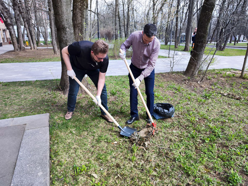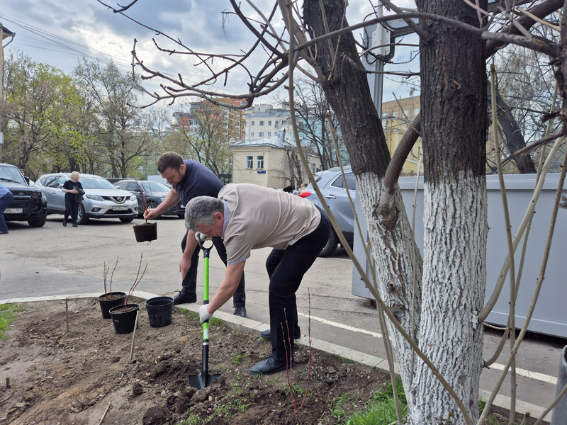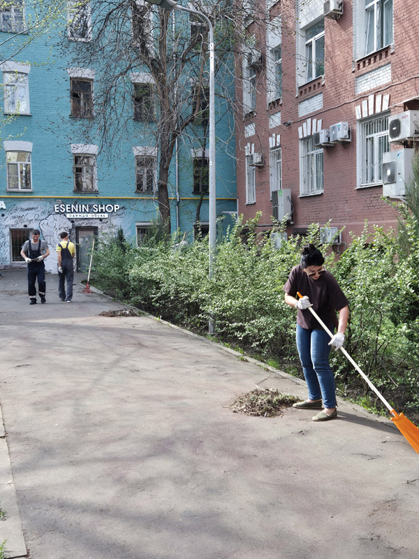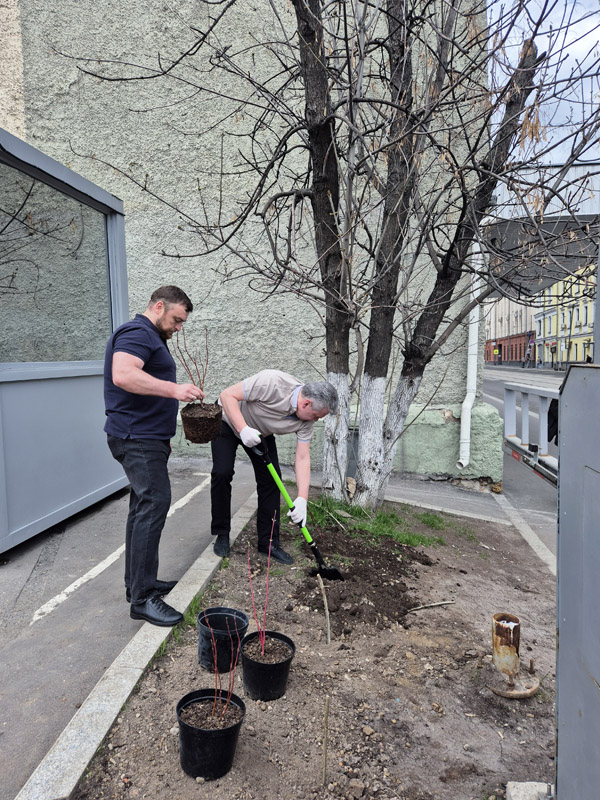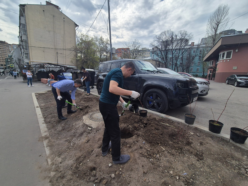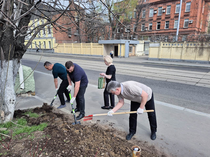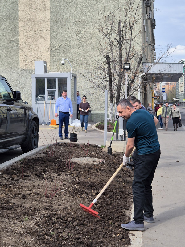 A command center was organized near the central office building on Suschevskaya Street in Moscow, where tasks were defined for each participant of the event and gardening tools were given out. Workers cleaned the areas of the public gardens, limewashed trees, planted white dogwood shrubs, and seeded the parking lot lawns with grass.