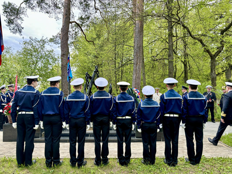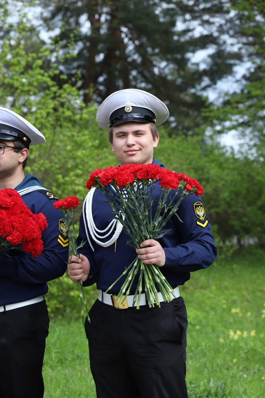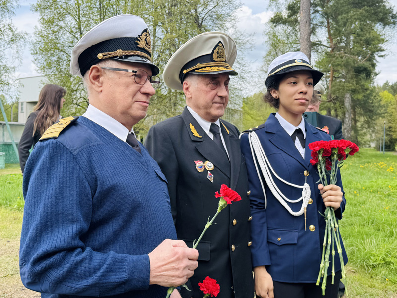 The guard of honor at the monument was carried by cadets of the Academy of Water Transport of the Russian University of Transport. The students solemnly brought out the flag of the Russian Federation, the flag of the Ministry of Transport of Russia and the Victory Banner. As a sign of military glory and blessing for the peaceful sky, the cadets presented the participants of the event with St. George ribbons.