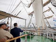 The tour of the sailboat was conducted by the ship's captain, Sergey Vorobyov. He talked about the history of the frigate, which has sailed around the world and won numerous international regattas. The guests got an idea of the ship's structure, inspecting the upper deck, rigging, wheelhouse, and internal service and living quarters.