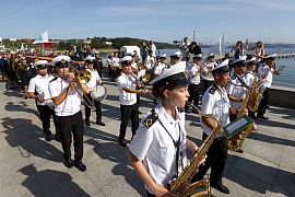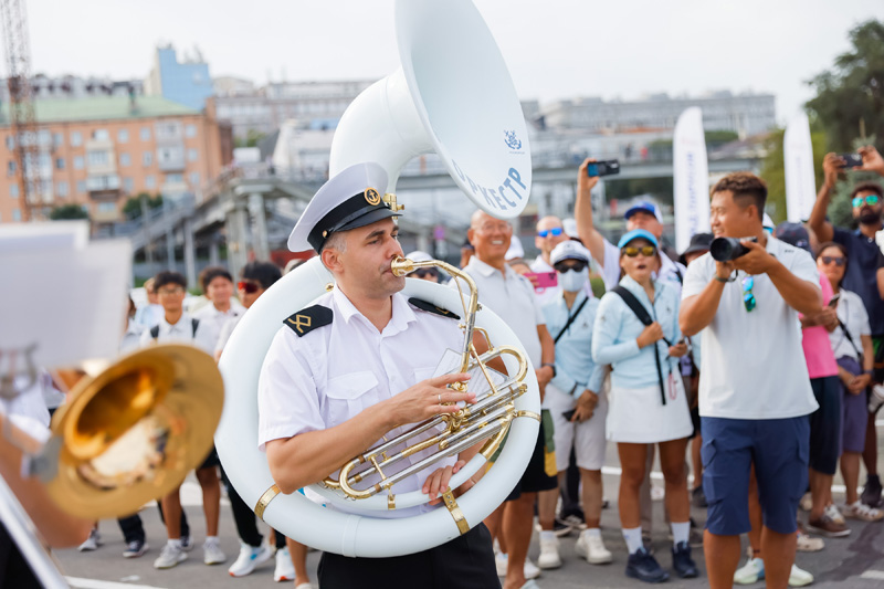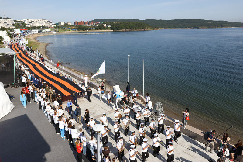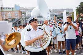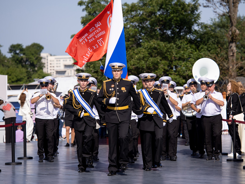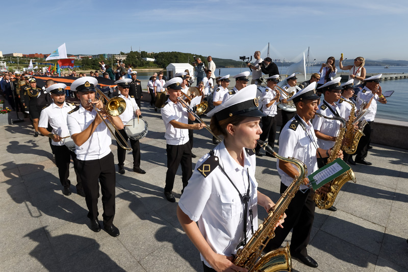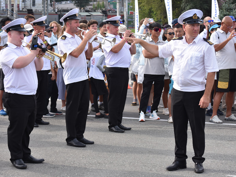 On September 3, the orchestra played at the award ceremony for the winners and prize-winners of the children's and youth regatta of the International Sailing Parade. The musicians also took part in the grand opening of the Far East Street exhibition which featured a procession with a large St. George's ribbon in honor of the 80th anniversary of the victory over militaristic Japan.