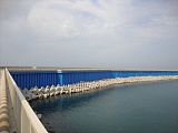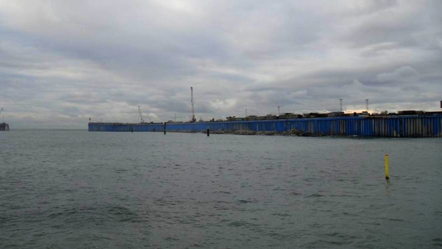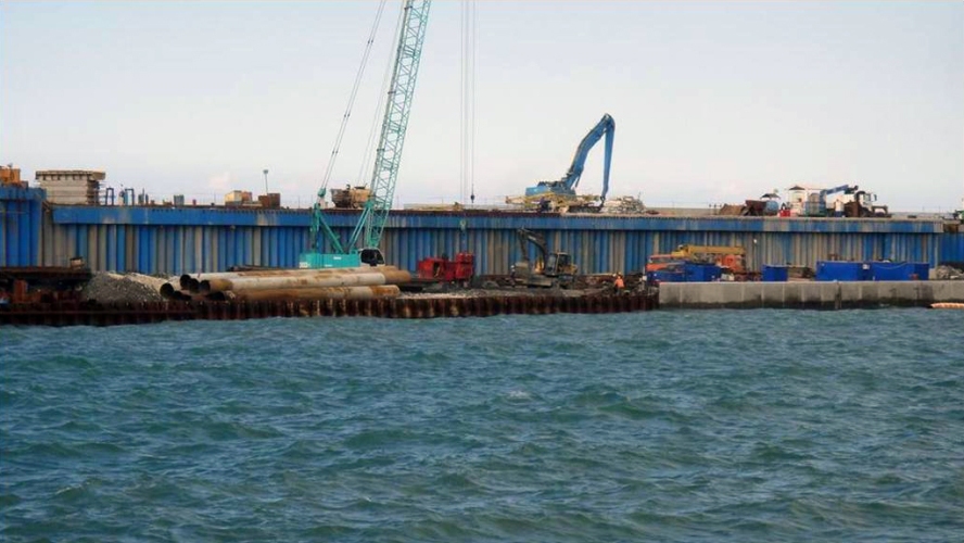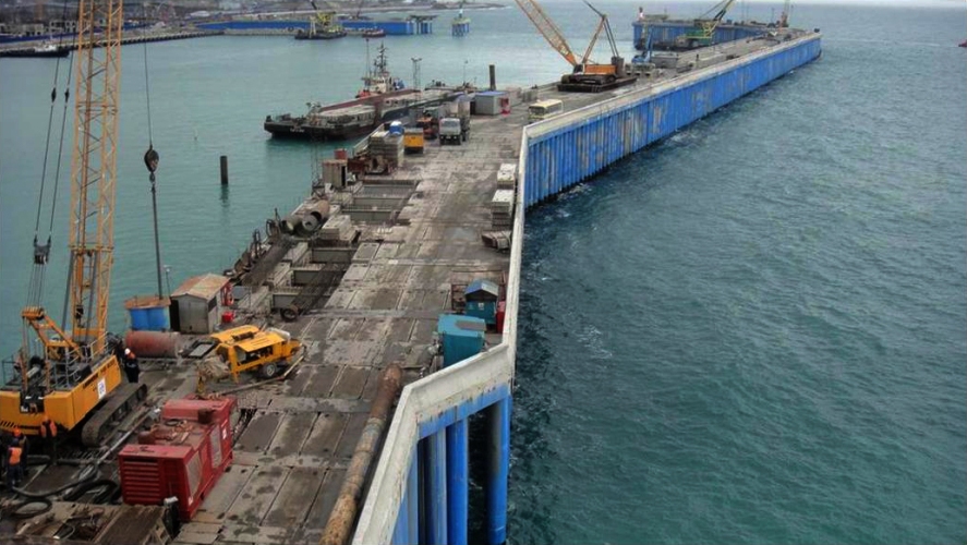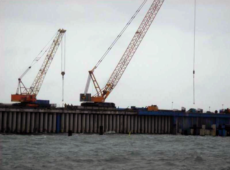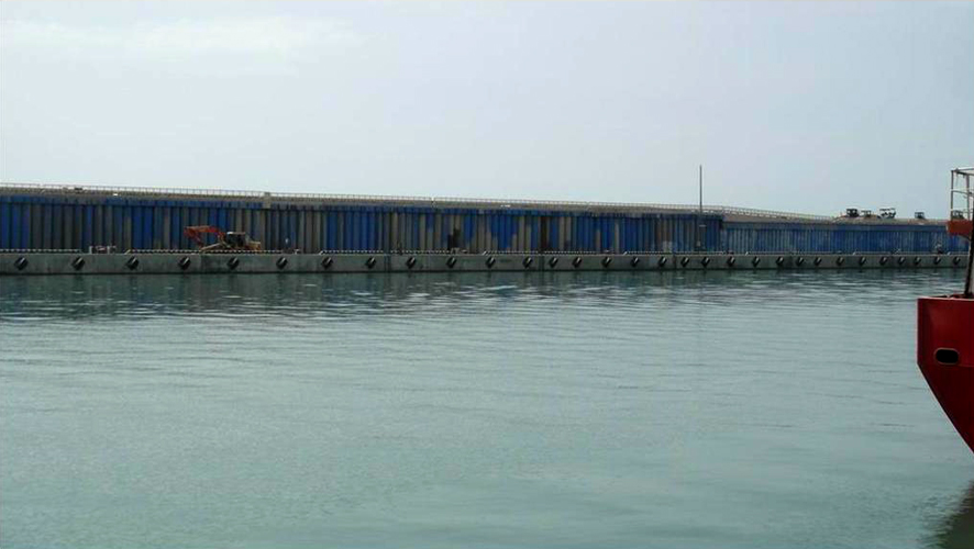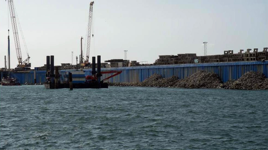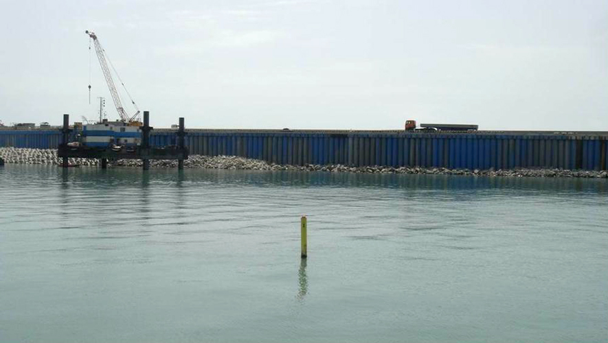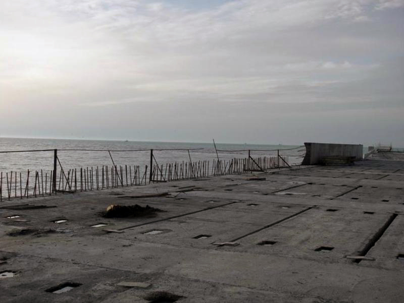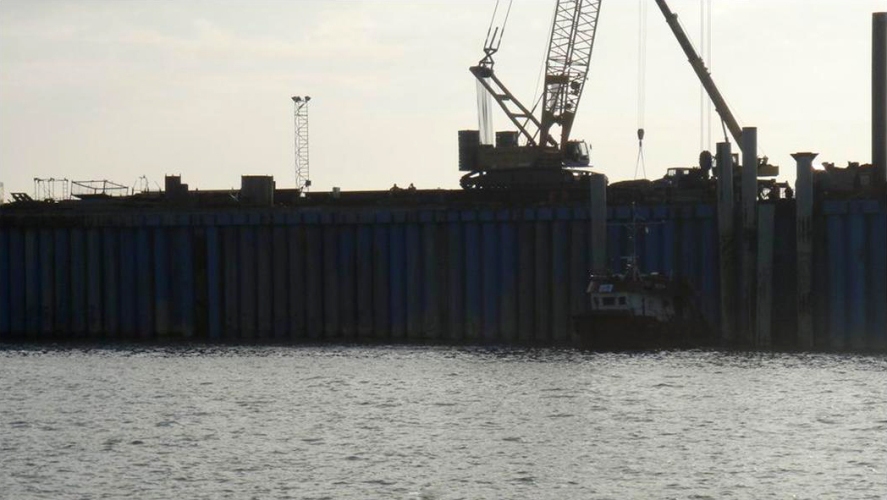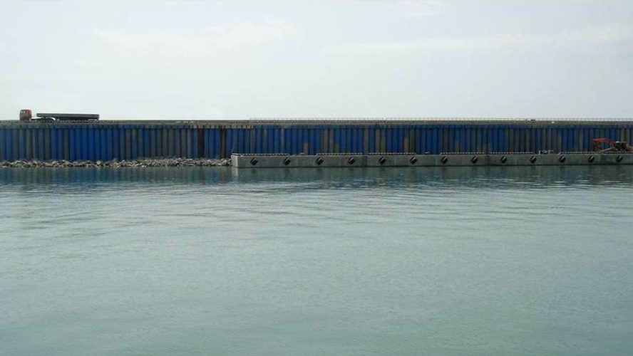 5) construction of the protective quay consisting of three sections with a total length of 1 km (length of the section No. 1 is 355 m, the length of section No. 2 is 375 m, the length of section No. 3 is 270 m), with a top level of +5.2 m;