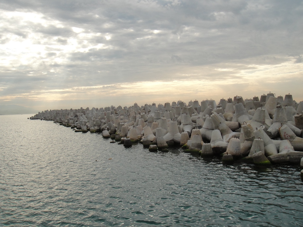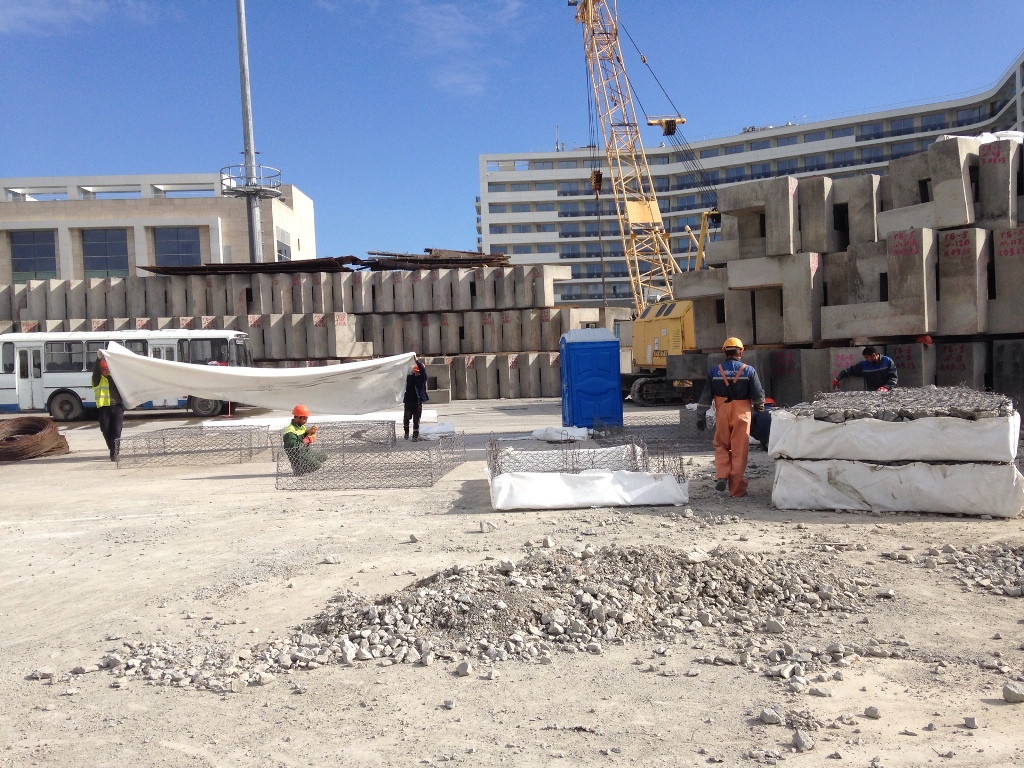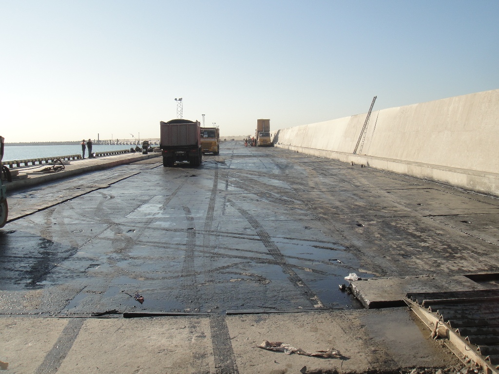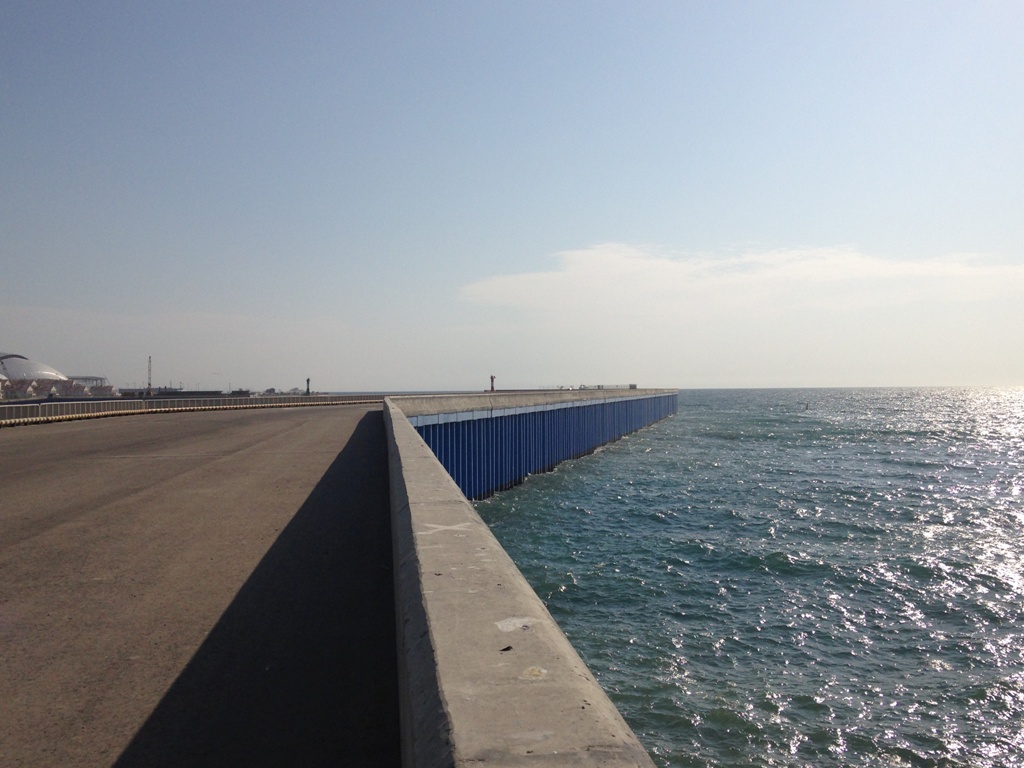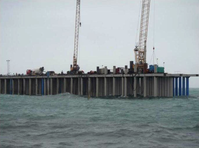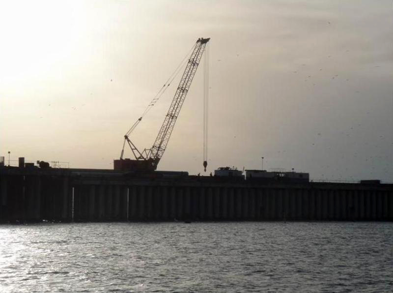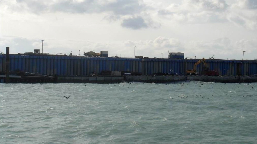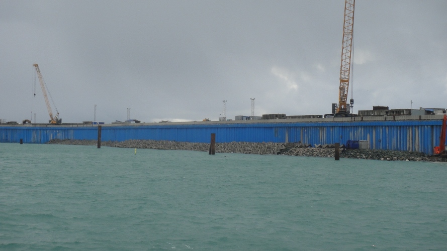5) construction of the protective quay consisting of three sections with a total length of 1 km (length of the section No. 1 is 355 m, the length of section No. 2 is 375 m, the length of section No. 3 is 270 m), with a top level of +5.2 m;