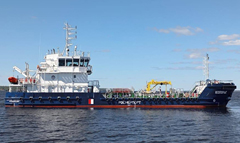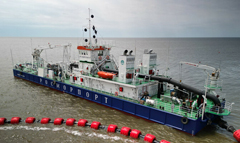 Self-propelled and -unloading trailing suction dredger with hold volume of 1,000 m3.